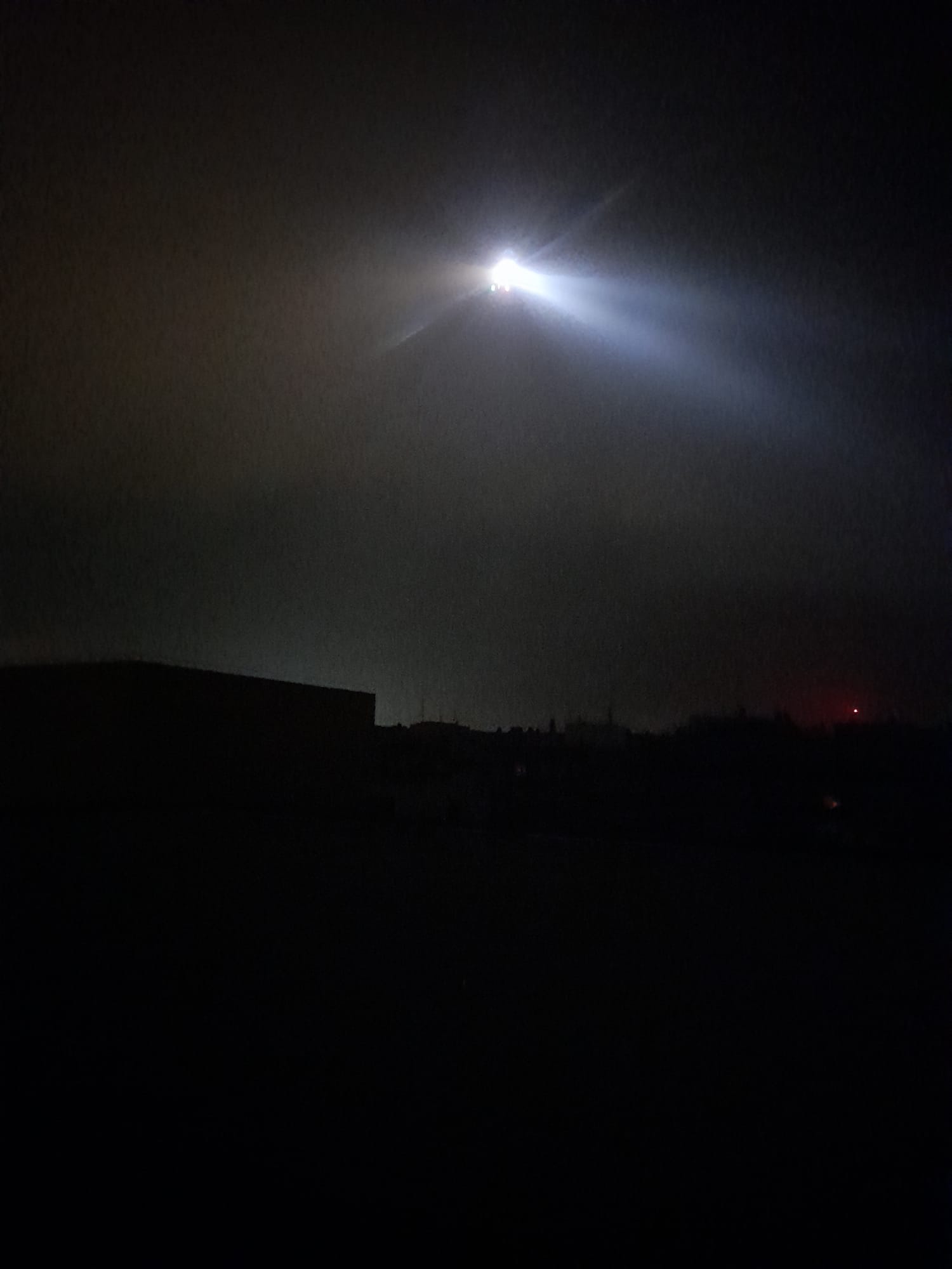 Una aeronave sobrevolando la Zona Cero en la noche del 29 al 30 de octubre de 2024: La foto fue tomada desde un balcón en Catarroja. Nuestra fuente, que prefiere el anonimato, no podía detectar si era un dron o un helicóptero. – Foto: mutantia.ch conoce nombre y apellido de la persona
