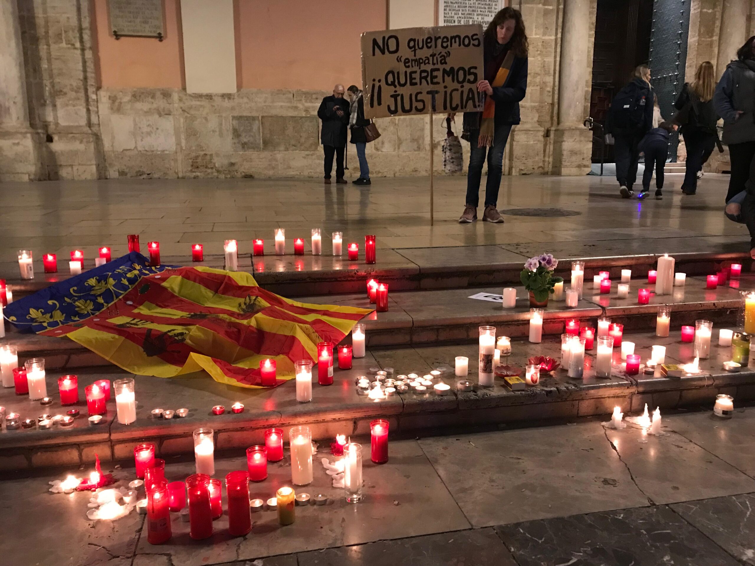 Tratando de unir fuerzas, a pesar de las divisiones políticas: familiares de víctimas en una acto de memoria el 28 de febrero de 2025 en la plaza de la Virgen, Valencia. – Foto: Romano Paganini